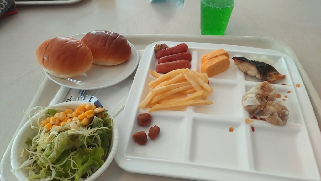 サラダやパン、ウィンナーなど朝の定番メニューを揃えて食べました。珈琲も美味しくて大満足。