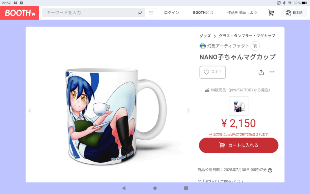 前回下書きしたイラストを完成させたので、PixivFACTORYでマグカップデザインの登録をしていきます。