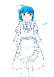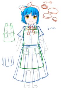まずは基本のエプロン姿。エプロンはやや厚手っぽい感じにして、半袖にする案。