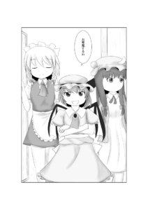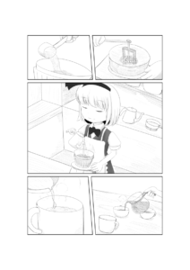 今回はカフェ漫画本の3巻目ということで、新しいお客さんが登場します。それもレミリア、咲夜、パチュリーの3人です。普段は紅茶を飲んでそうな3人が、コーヒーを飲みに来る。どんな感じになるか想像しながら描くのは楽しかったです。